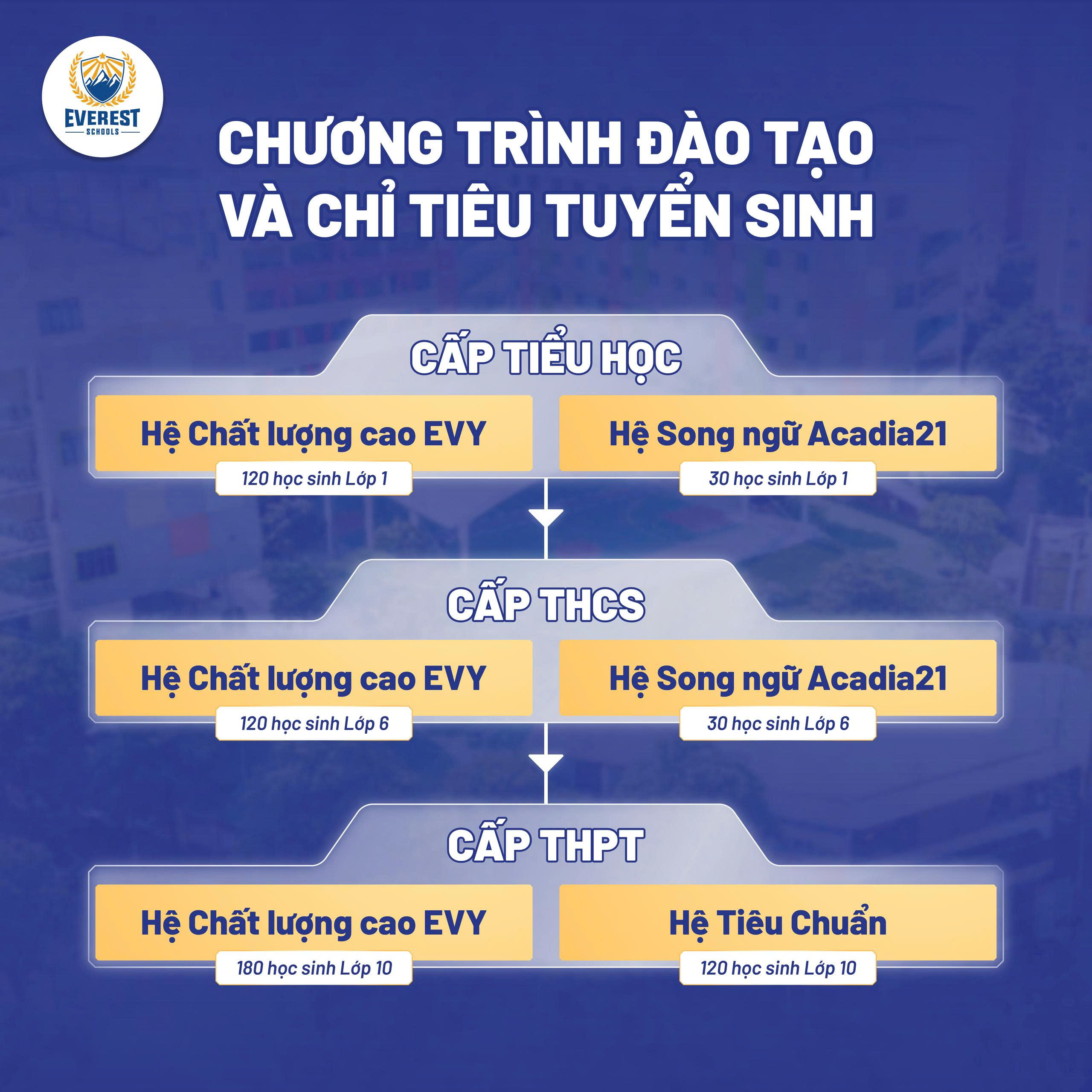 Tại Everest, mỗi học sinh được khuyến khích phát huy năng lực riêng, rèn luyện phẩm chất, nuôi dưỡng tư duy sáng tạo và tinh thần hội nhập. Nhà trường không chỉ giúp các em học tốt, mà còn giúp các em “biết cách học, biết cách sống và biết cách hạnh phúc” – từng bước trưởng thành trong môi trường giàu yêu thương, kỷ luật và cảm hứng.