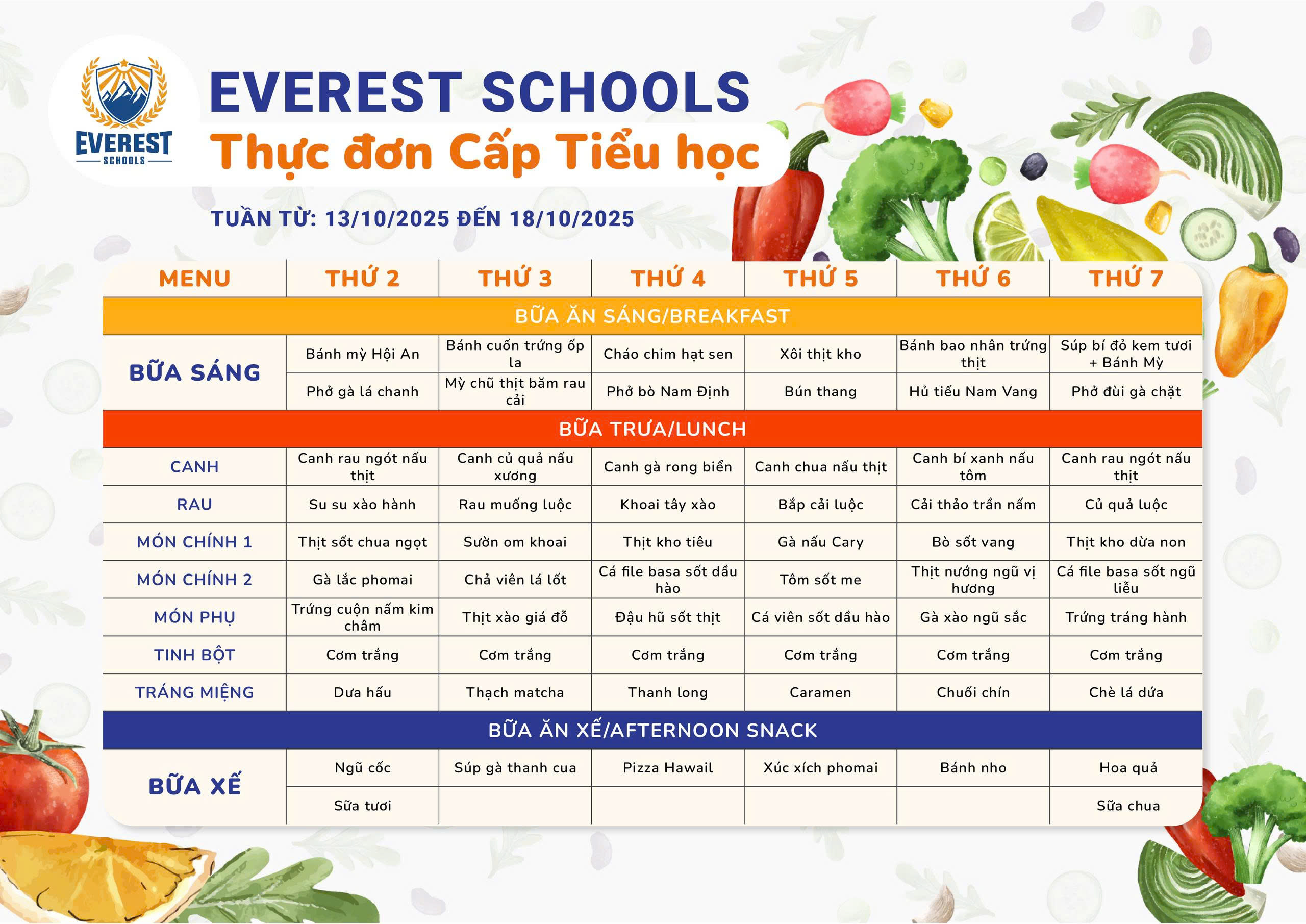 Thực đơn bữa ăn tuần 13/10/2025 - 18/10/2025