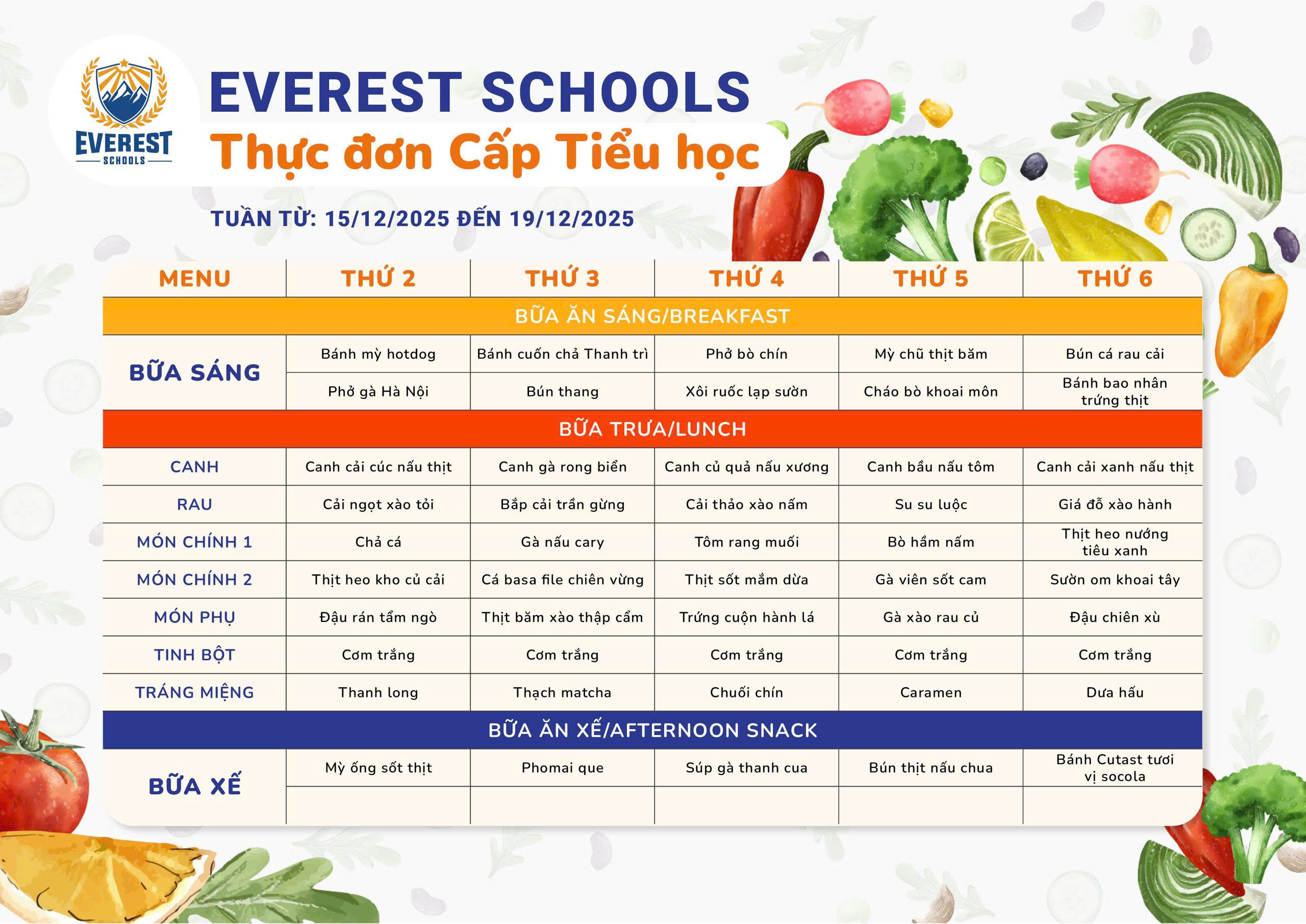 Thực đơn bữa ăn tuần 15/12/2025 - 19/12/2025
