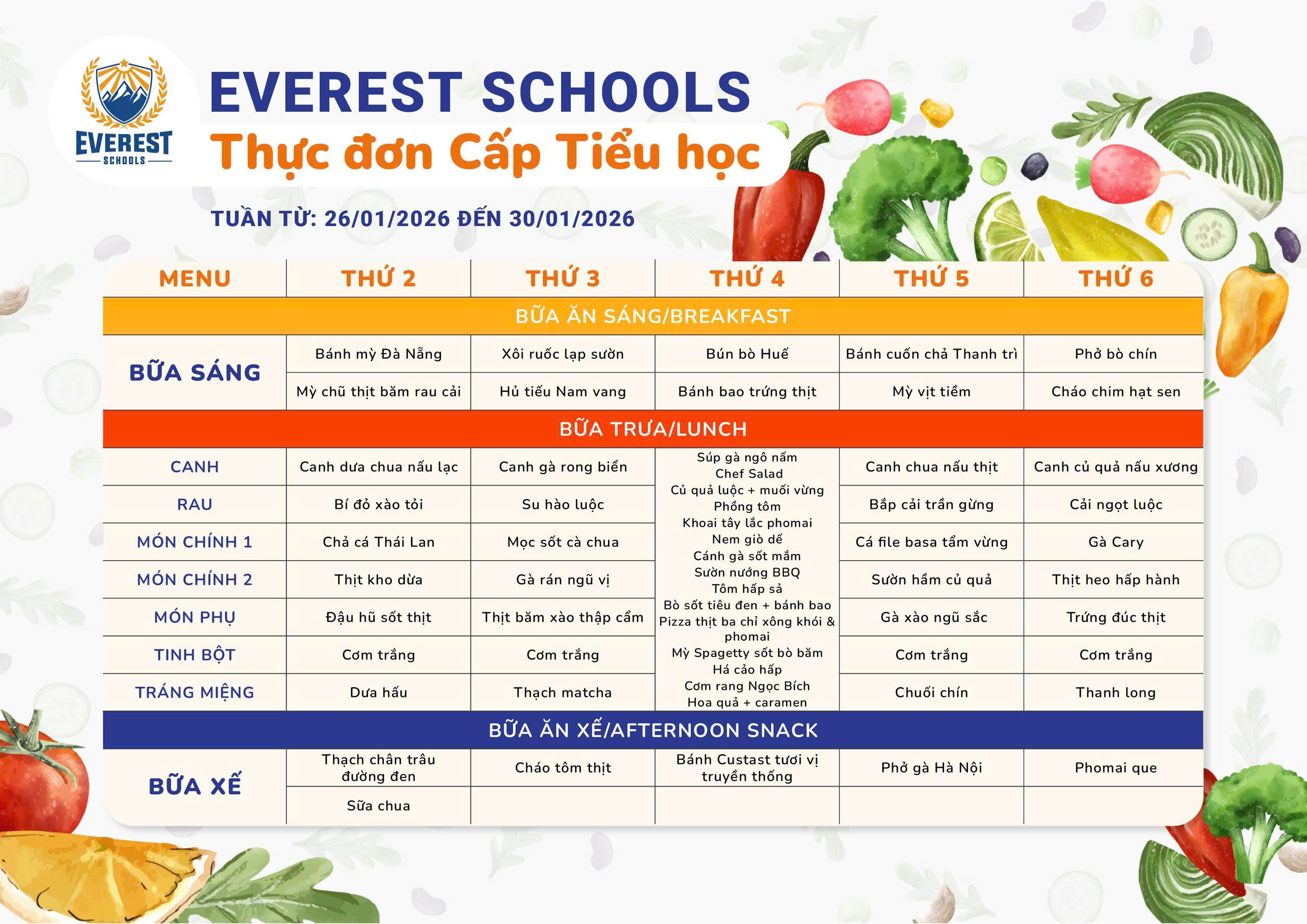 Thực đơn bữa ăn tuần 26/1/2026 - 30/1/2026