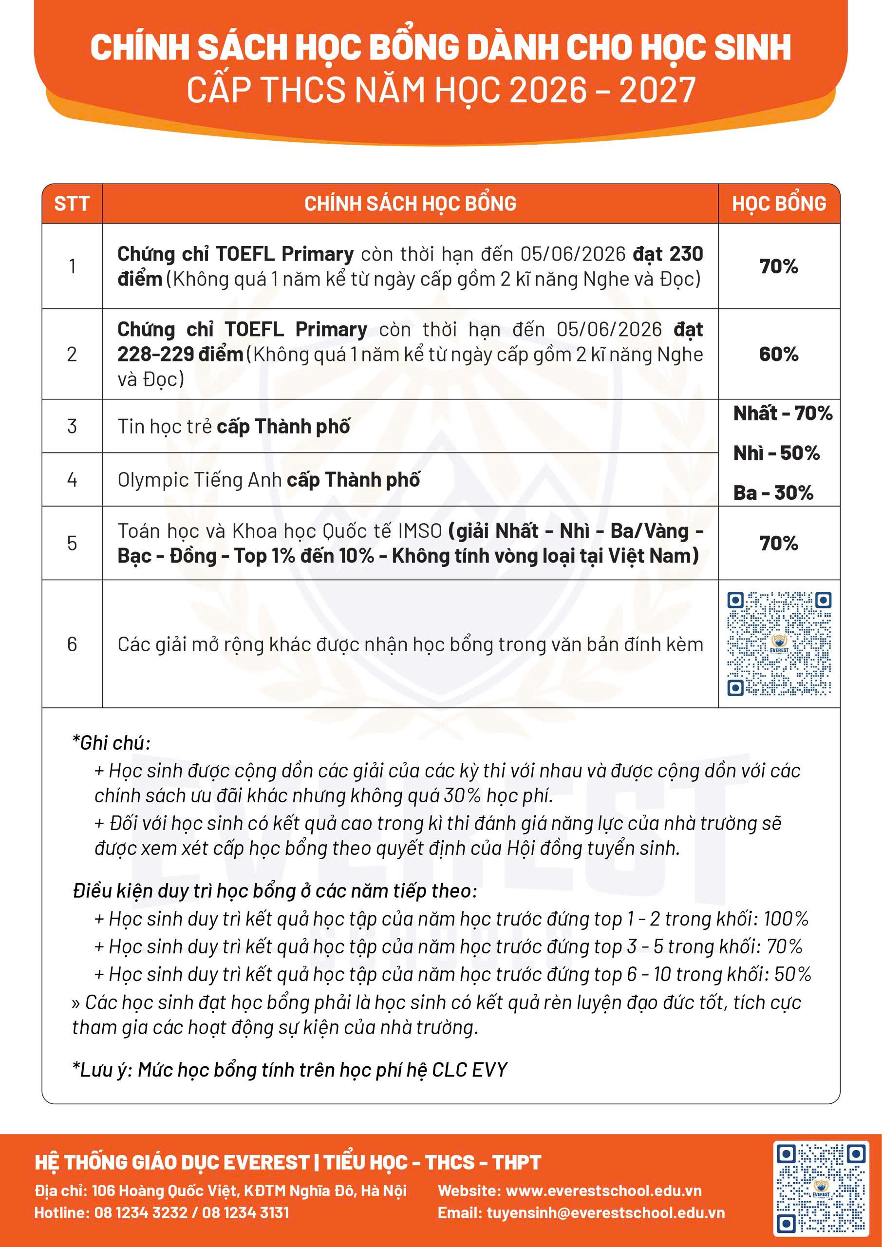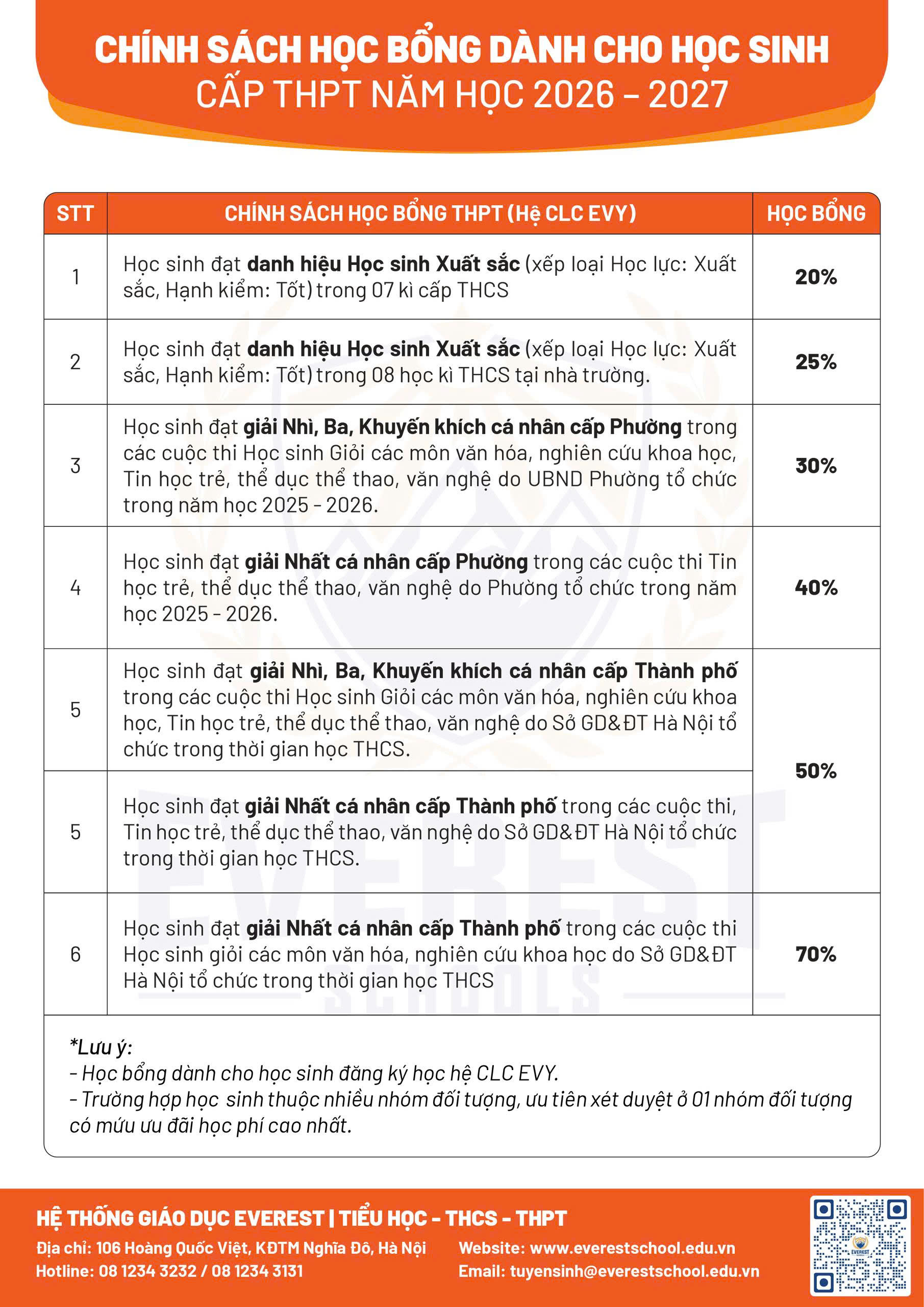 Everest Schools không chỉ mang đến những suất học bổng giá trị mà còn là lời hứa đồng hành cùng các em trên hành trình chinh phục tri thức, nuôi dưỡng khát vọng và vươn tới những tầm cao mới. Đây chính là cơ hội để các em học sinh tỏa sáng, tự hào và xây dựng tương lai cho chính mình.